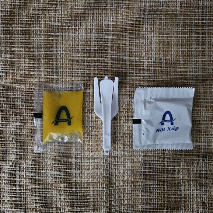 Вскрываем упаковку и испытываем удивление. Лапши то здесь нет. Хотя на упаковке и написано, что это суп, но всё равно ожидалась какая-то часть лапши. Ну, нет, так нет. Посмотрим, что же тогда они туда положили. А положили нам шесть пакетов с различными ингредиентами и маленькую ложко-вилку.