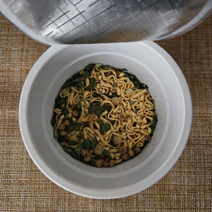 Внутри лапша уже объединена с сушёными овощами и соевым текстуратом.