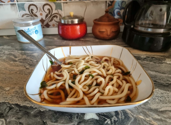 Дегустация. Готовим лапшу удон ровно так, как предлагает производитель: в 350 мл воды выливаем соус, доводим до кипения, добавляем лапшу и сушёности и варим ещё пару минут. Замечу, что соус, несмотря на жидкую консистенцию, почему-то не растворился в воде сразу и осел на дно. Пришлось ему помочь, размешав ложкой. В процессе варки лапша слегка разбухла и разбрелась по кастрюльке, и вот уже суп стал похож на суп. Чтош. Переливаем готовую лапшу в экспериментальную квадратную тарелку и приступаем к оценке результата. Бульон пахнет всё также чем-то неопределённо-морским. Остроты практически не ощущается, зато хорошо ощущается соль. Я люблю солёное, но даже для меня здесь с солью оказался перебор: можно смело ещё добавлять при варке 50-100 мл воды. В остальном бульон вполне приятен. Лапша набрала влаги и приняла нужную консистенцию: она упругая, но не жёсткая, вот прям такая какая и должна быть лапша. Кусочки морепродуктов и прочие добавки тоже дошли до кондиции и хорошо дополняют вкус лапши. Результат получился лучше, чем я ожидал. Мы имеем полноценное первое блюдо, которое не похоже на привычные дошики, хотя и с домашней кухней (ну, чисто в моём понимании) ассоциаций не вызывает. Ассоциации возникают с каким-нибудь кафе азиатской кухни - если бы мне подали эту лапшу там, я бы и не подумал, что это бичпак, сваренный за две минуты. В целом вкусно и приятно за исключением некоторых моментов, которые легко исправляются дополнительным количеством воды. Я наелся и остался доволен. Если насыпать всяких дополнительных опций, как нарисовано на упаковке, то и вовсе будет пушкабомба.