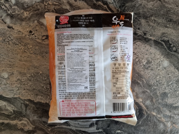 Здравствуйте, мои маленькие любознательные дошираковеды. Предмет нашего сегодняшнего исследования - корейская лапша удон со вкусом креветки от производителя Hanil Food Co. Данный экземпляр относится к категории "влажный бич", то есть лапша здесь содержится не в сушёном, а в полуготовом виде, запаянная в вакуумный пакетик. Исследуемый образец был приобретён в Хабаровске в гипермаркете Brosco Mall за 119 рублей по акции. Путём нехитрого гуглежа в сети интернет удалось выяснить, что он также встречается в магазинах сети Ашан по цене 180 рублей за пачку и на маркетплейсах по какой-то несусветной стоимости более 400 рублей.