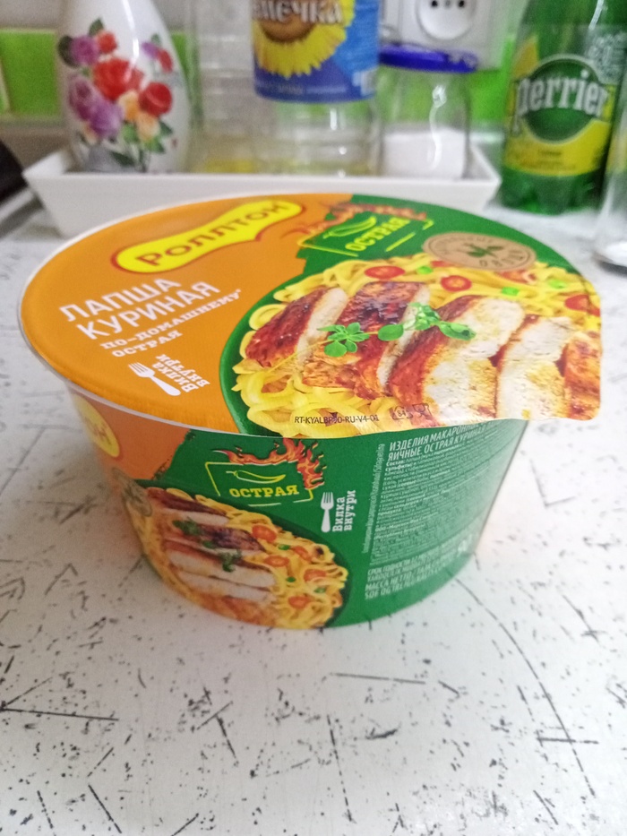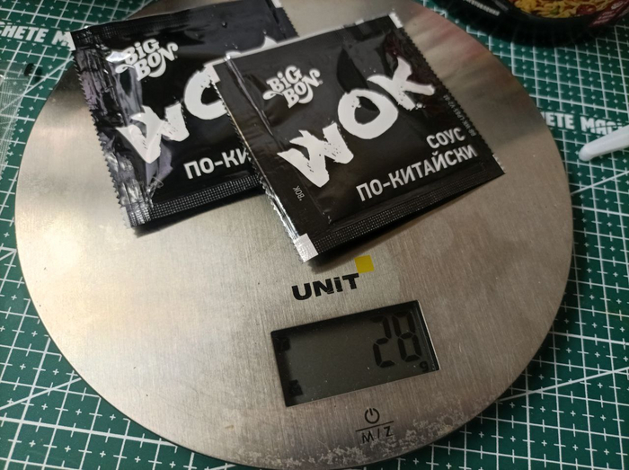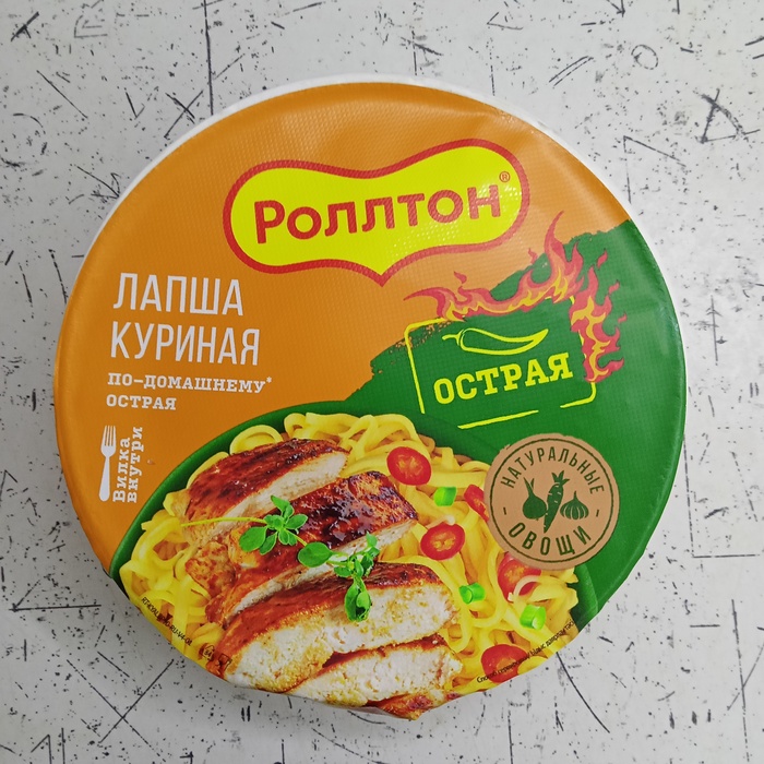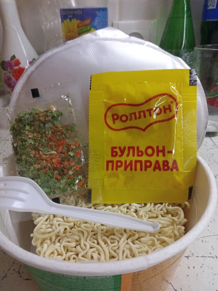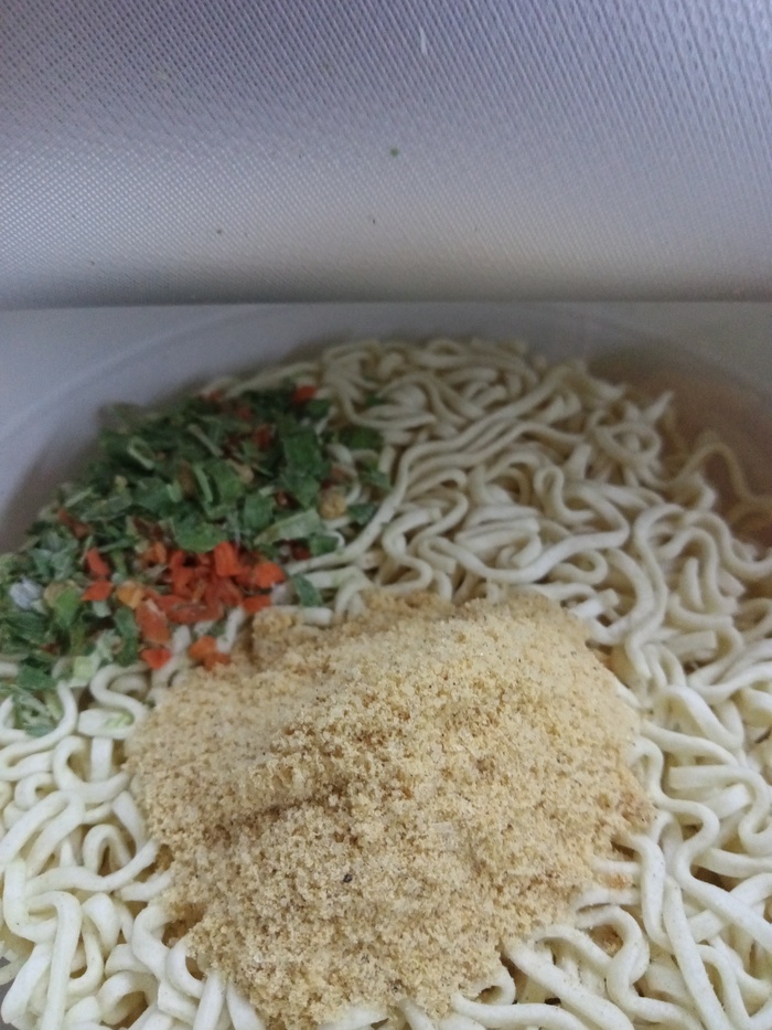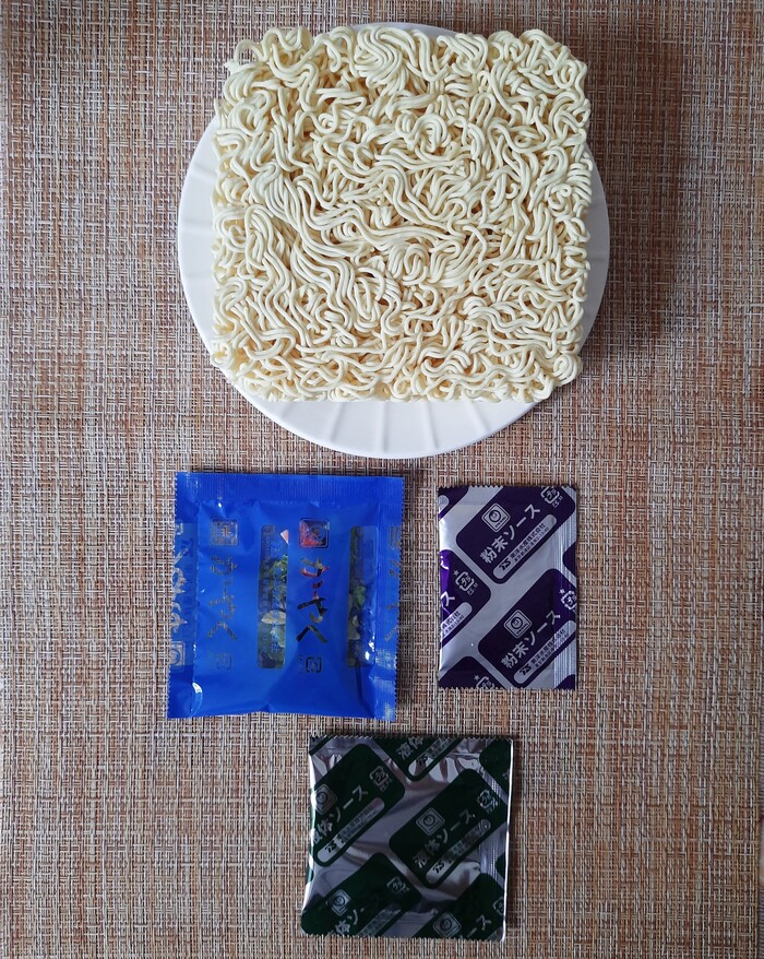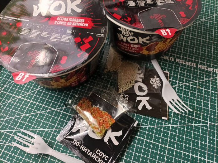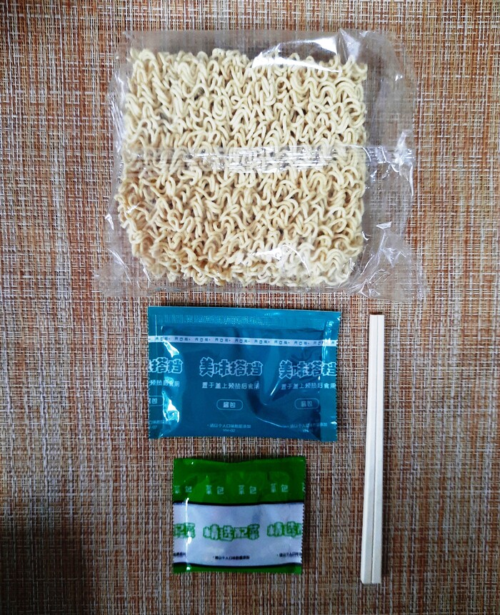 Под плотной верхней крышкой находятся брикет лапши и три пакета с приправами. После прошлого образца выглядит скромненько.