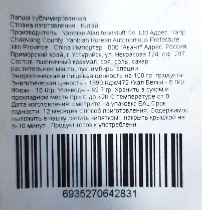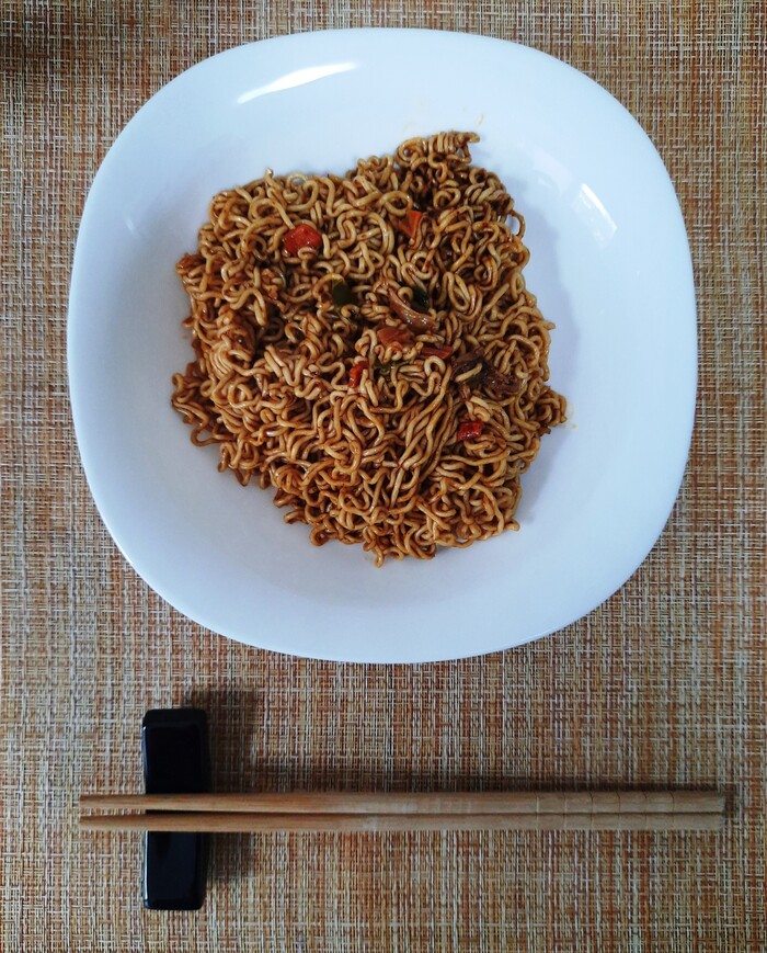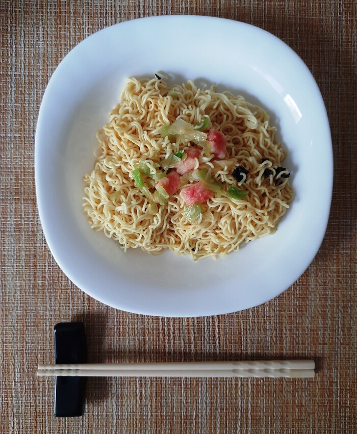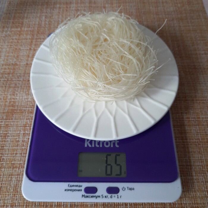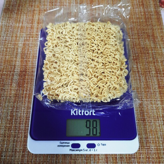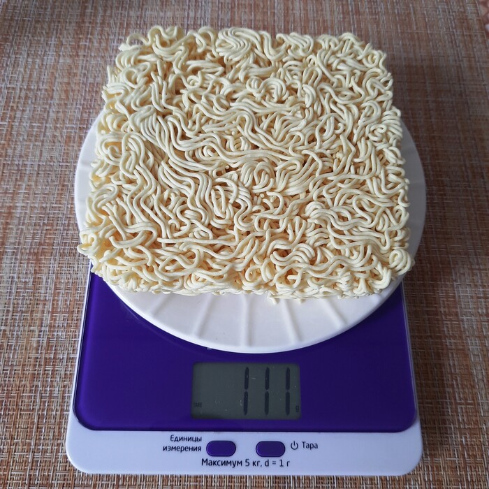 Лапша пшеничная. Светлая, тоненькая, волнистая. Масса составила красивые 111 граммов. Удивительно, что она не пахнет жареным, да и не выглядит жареной, хотя, вроде как, должна.