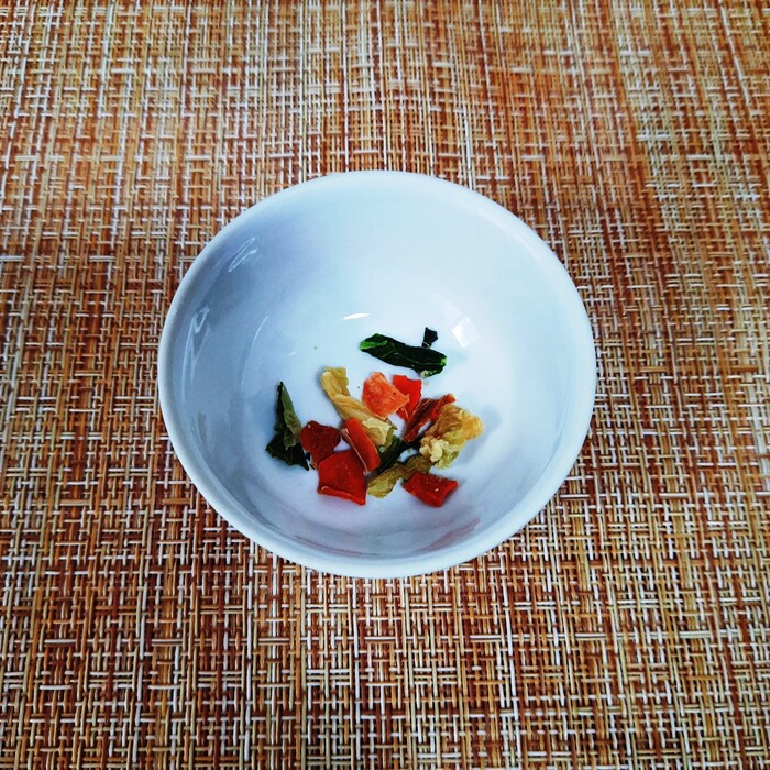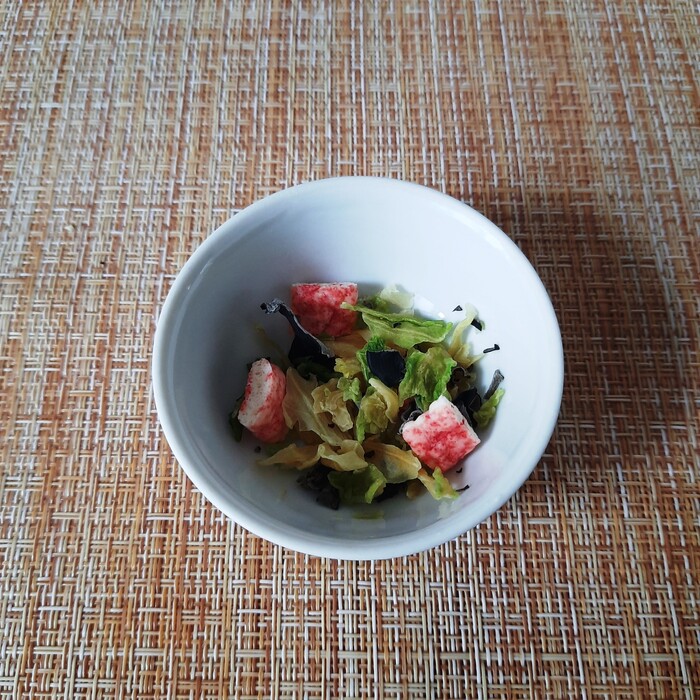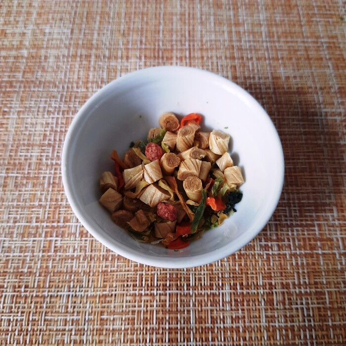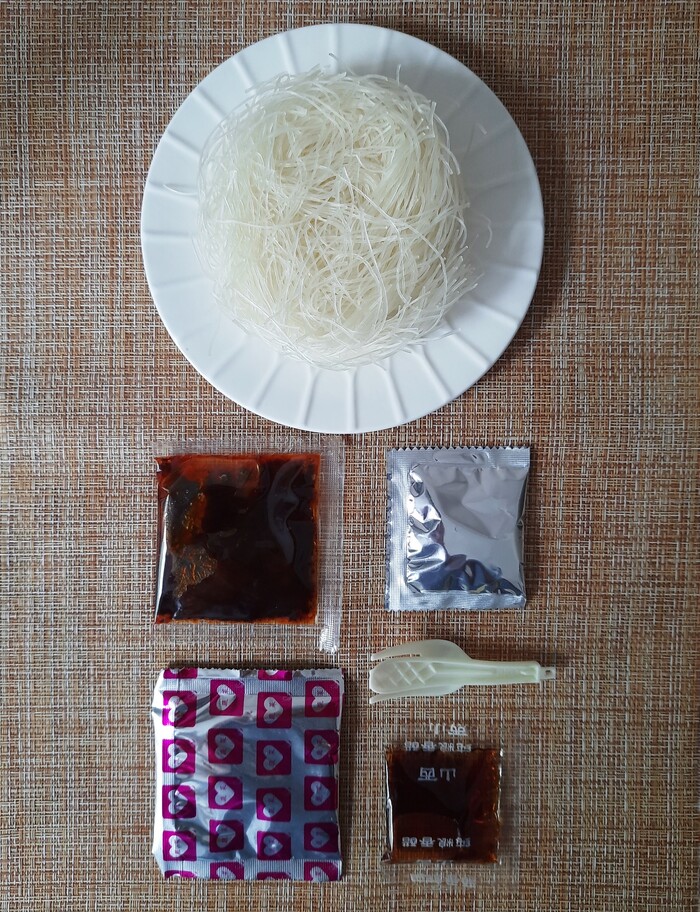 В первом пакете нас ждут сушеные овощи и крабовые палочки. Из овощей два вида капусты и древесные грибы. Крабовые палочки пахнут как и должны, хотя видно, что изготовлены из соевого текстурата. В целом порция приличная и видно высокое качество ингредиентов.