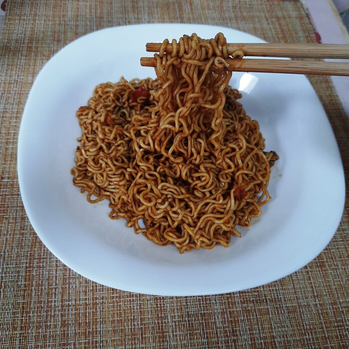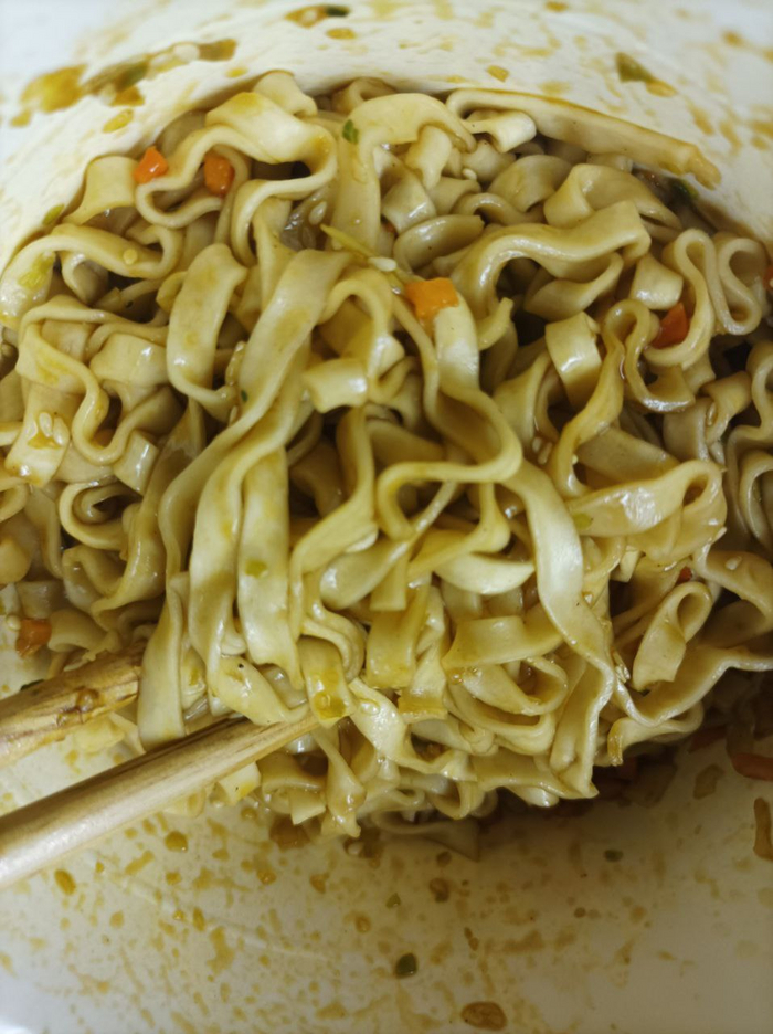 После заваривания выливаем сначала масло, затем перемешиваем и добавляем сухую приправу. Еще раз перемешиваем и сервируем. После добавления масла в лапшу пошел запах арахиса, хотя в составе о нём не говорится. Аллергики, будьте внимательны!