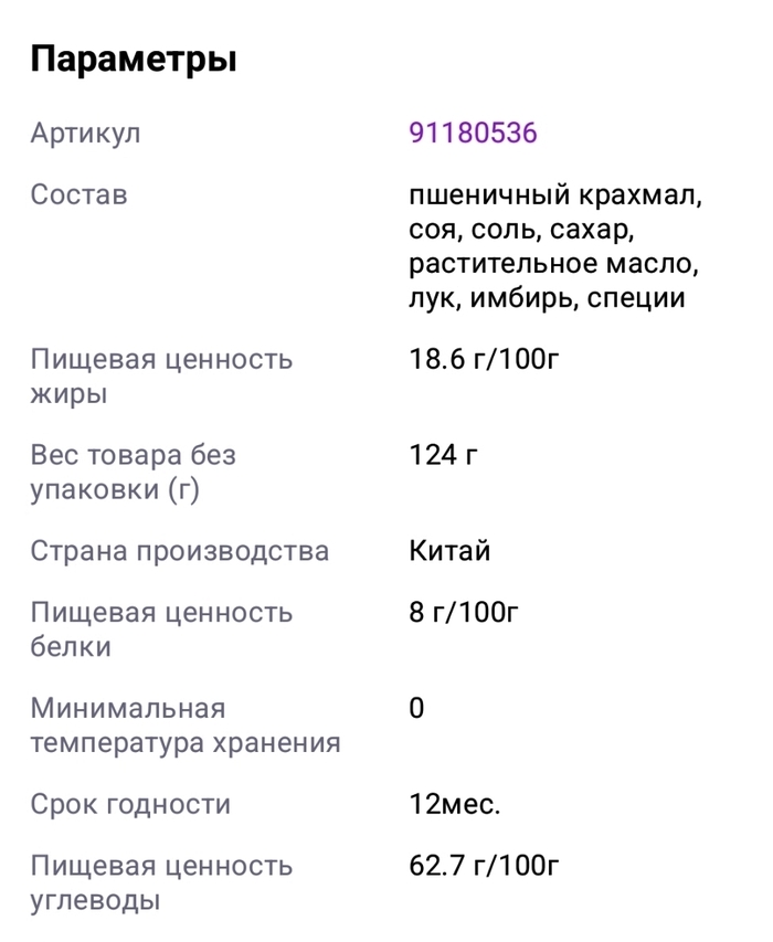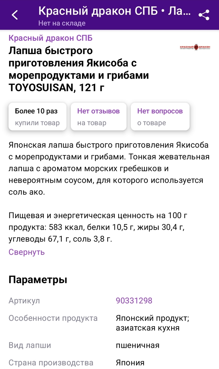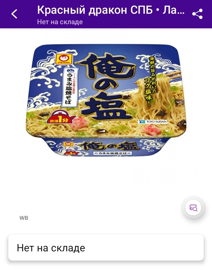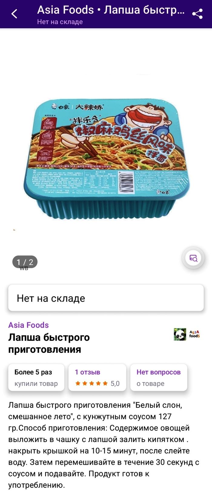 Ну и, как обычно, скрины с ВБ. На случай, если кого-то заинтересует. Хотя на сегодняшний день товар отсутствует в наличии. После прошлого поста несколько комментаторов посчитали мои посты рекламой и обвинили в связях с продавцами на ВБ. Так вот я категорически заявляю, что мои посты не являются рекламой. Никакой связи с продавцами данных продуктов я не имею. Мои обзоры это хобби и их цель - поделиться с вами своими впечатлениями от новых для себя образцов лапши и, возможно, помочь кому-то определиться и сделать выбор. Ну что-то я отвлекся. Вернёмся к нашим баранам.