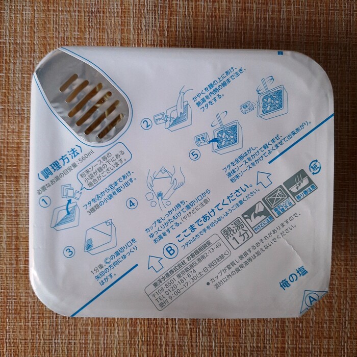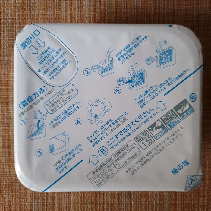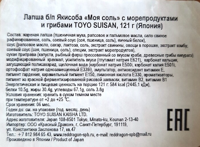 Привет, друзья! Опять я на связи из своей лаборатории. Сегодня исследуем гостя из Японии. Якисобу с морепродуктами и грибами от производителя Toyo Suisan Kaisha ltd. Приехал ко мне наш сегодняшний подопытный опять через Wildberries и обошёлся в 233 рубля. Упаковка по размеру чуть больше стандартного Доширака. Снаружи обтянута пленкой с принтом в сине-голубых тонах, на которой находится вся информация о продукте на японском языке. Также имеется русскоязычный стикер.