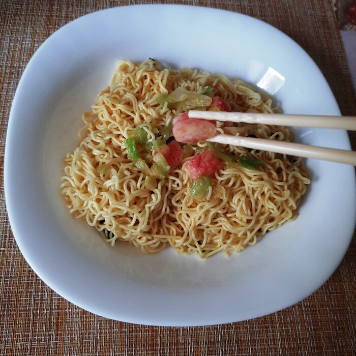Блюдо получилось очень красивое! Выглядит здорово! Размер порции приличный. Снимаем пробу. Лапша тонкая, упругая, очень вкусная сама по себе. А вот жареного я так и не ощутил. Лапша вместе с соусом в принципе вкусна, но нет обещанного вкуса морепродуктов. В общем чувствуется соль на довольно приличном уровне и аромат чёрного перца. Вкусно, но без изюминки. Остроты нет совсем. Овощная составляющая на высоте. Капуста - это прям капуста, грибы - это грибы. Очень классно! Крабовые палочки после заваривания стали практически неотличимы от обычных. Тоже зачёт!