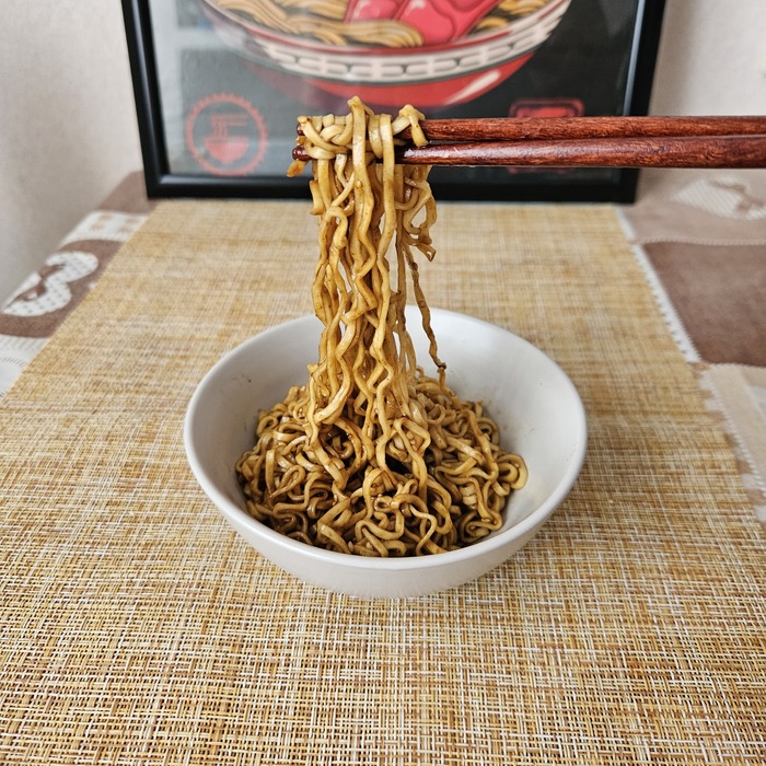 Средняя по размеру порция красивой светло-коричневой волнистой лапши. Запах преобладает сырный. Его интенсивность несколько уменьшилась. Соотношение лапши и соуса в самый раз чтобы не быть сухой, но и не превратиться в суп. Снимаем пробу. Соус напомнил мне таковой от Самьянг. Вначале сладкий, с нежным сырно-сливочным вкусом, затем ощущается острота, которая нарастает постепенно и достигает значительных показателей. Боюсь ошибиться, но все 10-12 островатт там будет, что ставит данную лапшу в один ряд с Buldak 2x spicy. Но вот карбонара тут даже рядом не стояла. Сама лапша просто великолепна! Вкусная, плотная. Ничуть не уступает тем же Самьянг.