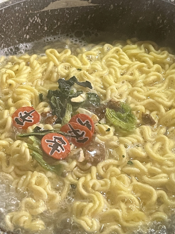 Инструкция по приготовлению присутствует и даже на русском языке. Варим лапшу в 600 мл. воды, после чего сливаем, оставив 50 мл. воды, добавляем содержимое пакетов и перемешиваем. Время варки не указано, но я варил 5 минут и всё получилось замечательно. Итак, что мы видим после всех вышеописанных действий.
