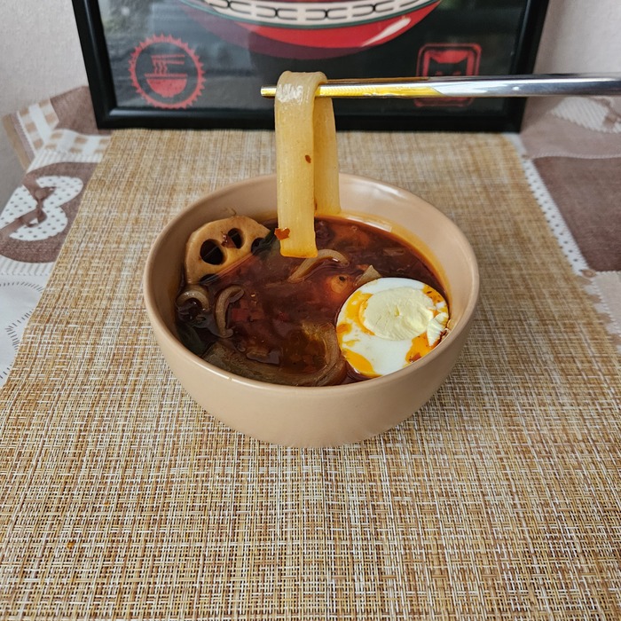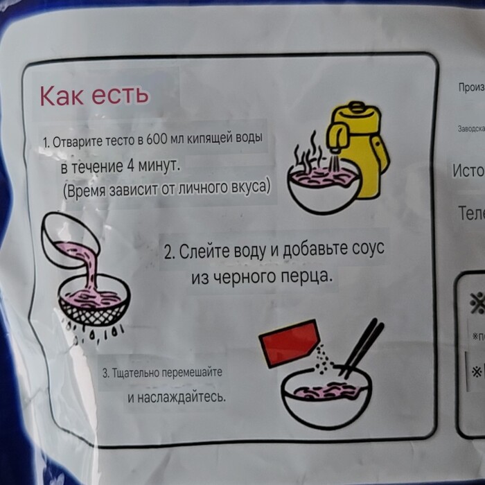 Перевод текста вносит некоторую путаницу, т.к. говорит, что лапшу нужно варить 4 минуты, а судя по иллюстрациям просто залить кипятком. Поразмыслив, я решил, что буду просто заваривать.