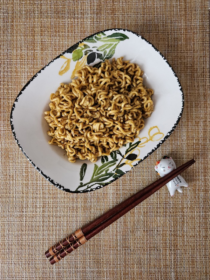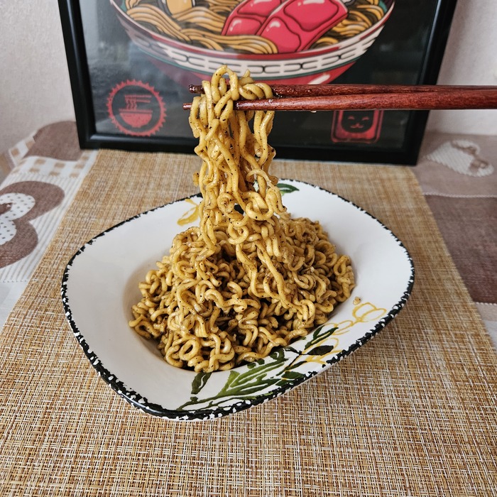Порция средняя. Ароматы сумасшедшие! Спешим попробовать. Лапша, конечно же, на спагетти не похожа. Но тем не менее весьма вкусна. На мой вкус чуть аль-денте. Возможно всё-таки стоило отварить её. Но это всё вкусовщина. Соотношение лапши и соуса хорошее. Лапша не сухая. Соус душистый, пряный, с выраженным вкусом чёрного перца. Притом вполне острый. Я бы сказал 2-3 островатта.