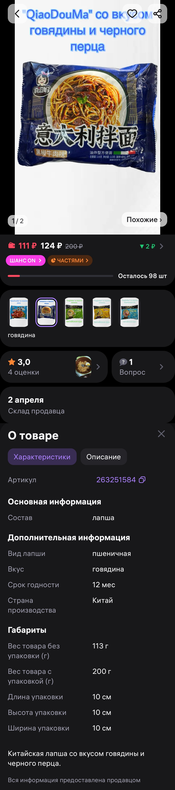 Здравствуйте, дорогие друзья! Перед тем, как рассказать вам о результатах работы нашей лаборатории за прошедшую неделю, хочу выразить благодарность за донаты и комментарии. Также рад приветствовать новых подписчиков. Спасибо, что читаете! Ну а я перехожу к основной теме своего поста. В этот раз лапша попроще, чем в прошлом обзоре, но и гораздо бюджетней. Для ЛЛ: очень неплохо. Можно брать. Куплена на WB за 126₽. Произведена в Китае. Если кому-то интересно, то производителем значится Shangqiu Tongfu Food Co. Ltd. Упаковка мягкая, цвет синий, размер стандартный. В оформлении используются узнаваемые итальянские достопримечательности. Также можем увидеть и флаг Италии. Это наталкивает на мысли, что данная лапша имеет какое-то к Италии отношение. Возможно производитель пытался воспроизвести знаменитую пасту Качо э пепе. Будем пробовать. Напоследок отмечу, что на упаковке нет информации на русском языке. Только иероглифы.