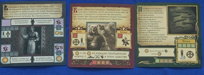 Наследием Старой Руси я остался доволен. Здесь классно вплетена нарративная составляющая. Карт событий в коробке довольно много, и происходящие события в игре меняются от партии к партии. Да, вы не ощутите себя полноценно в сказке, но все-таки немного атмосферы это добавляет.