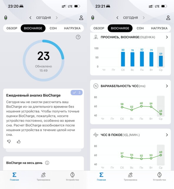 На первом экране встречает виджет с главными данными - Обзор, Biocharge, сон и нагрузка. Чуть ниже — основные метрики.