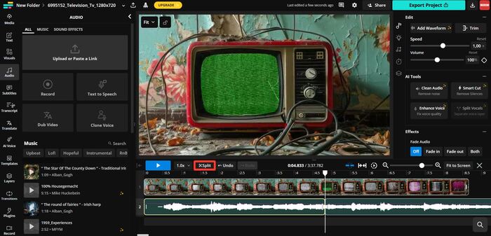 Veed.io — нейросетевая платформа, которая умеет не только накладывать музыку, но и сама создавать субтитры, убирать фоновый шум, даже исправлять взгляд в камеру. Для работы с аудиодорожкой тут есть крутая штука: ИИ умеет сам подбирать мелодию под настроение и темп твоего материала.