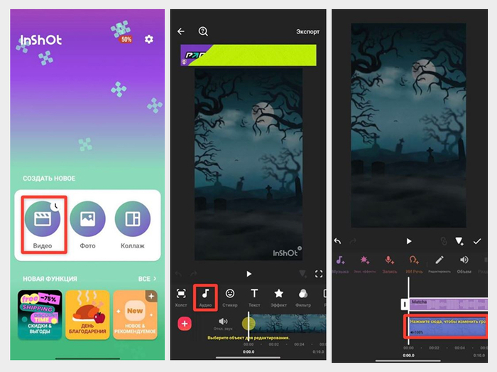 Ещё одна фишка — InShot умеет извлекать аудиодорожку из других материалов. То есть если понравилось что-то из чужой записи, можешь вытащить это и использовать в своей.