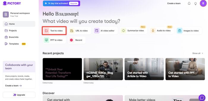 Зайдите в Pictory, создайте аккаунт и перейдите в «Text to Video».