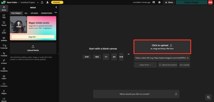 Зайдите на Kapwing и создайте аккаунт. Откройте «Click to Upload» и загрузите видео с ПК.