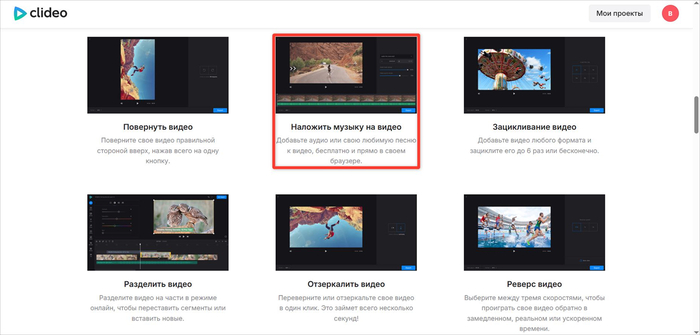 Clideo — сервис с десятком отдельных инструментов для разных задач: укоротить материал, склеить, наложить шумы и эффекты. Интерфейс простой и понятный, на русском языке. Работает без регистрации, но на выходе ставит водяной знак. Чтобы его убрать, надо оформить подписку.