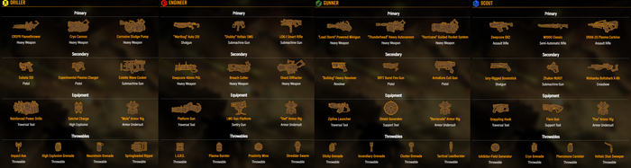 В игре очень большой арсенал оружия, который делится на 4 типа урона — электрический, кинетический, плазменный и огненный. Разумеется, сочетая их и выбирая правильные улучшения, вы становитесь машиной для убийства жуков. Так как в игре есть улучшение мастерства оружия (а их нужно улучшать), вы точно поиграете с каждым оружием и не один раз. Разумеется, всё оружие вам придётся сначала найти и открыть, а потом уже улучшать.