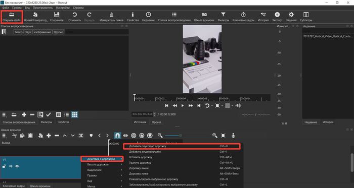 2. Правой кнопкой мыши зайдите в «Действия с дорожкой» и кликните «Добавить звуковую дорожку». После нажмите «Открыть файл» и загрузите его.