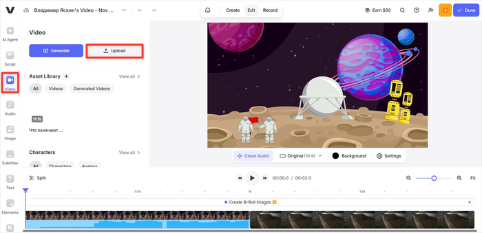 Откройте Veed.io, в меню сверху найдите«Edit».