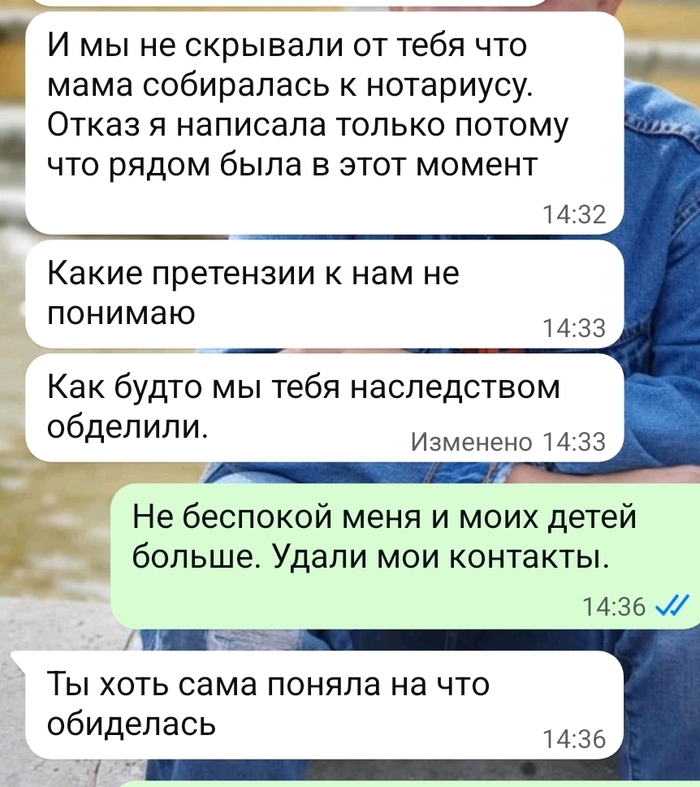 Ведь как только у меня начались проблемы в жизни, о которых она прекрасно осведомлена, она мне сразу как ножом в спину со своим разводом вместо поддержки. Так что я видеть её в принципе не хочу особо.