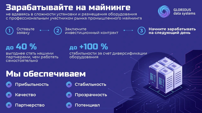 И наиболее удобный, а главное, прибыльный вариант майнинга - это майнинг под ключ в специализированных дата-центрах. Вам не нужно будет покупать оборудование и его обслуживать. В моем случае с Glorious я хоть и продал свои асики, на которых майнил еще в гараже, но все равно являюсь собственником нескольких асиков, который я купил через инвестиционный контракт. Срок окупаемости у меня вышел 16 месяцев.