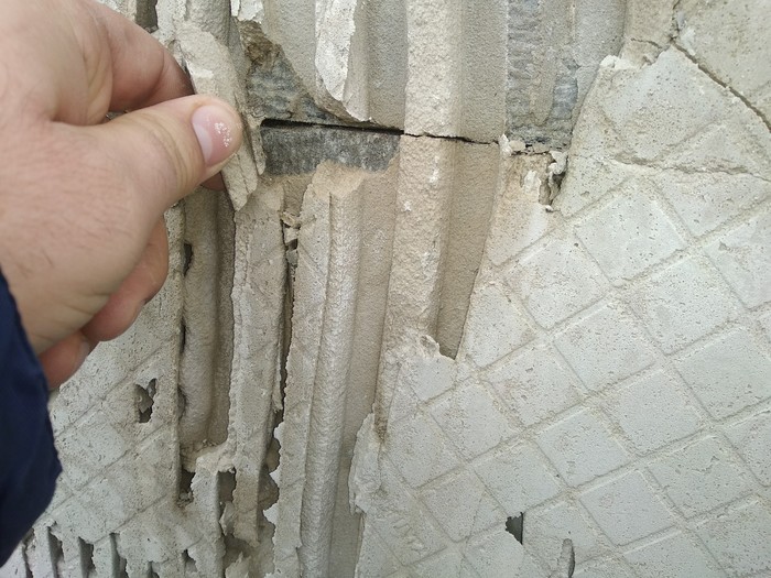 К мастерам нет претензий - клей сперва нанесен на стену, затем на плитку. Промывались ли несущие поверхности, непонятно.
