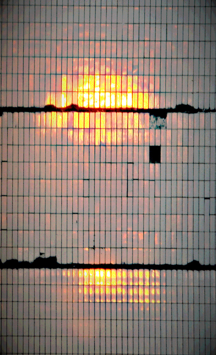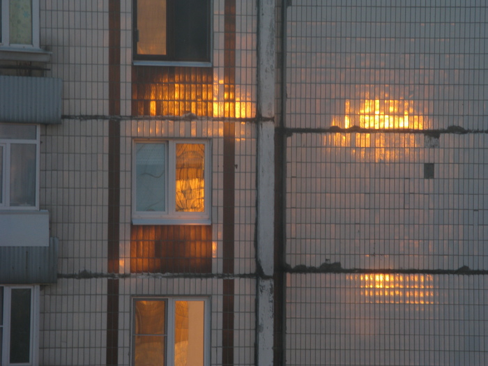 Переотраженный закатный свет на облицовочной плитке. Фильтрованные в gimp обрезки (с размазыванием зерна через filters>blur>mean curvature blur) и оригинал из jpeg.