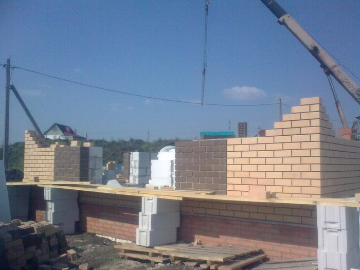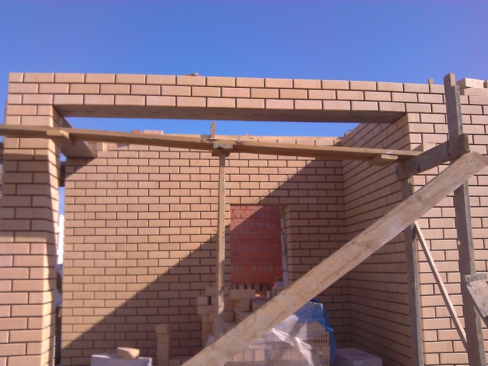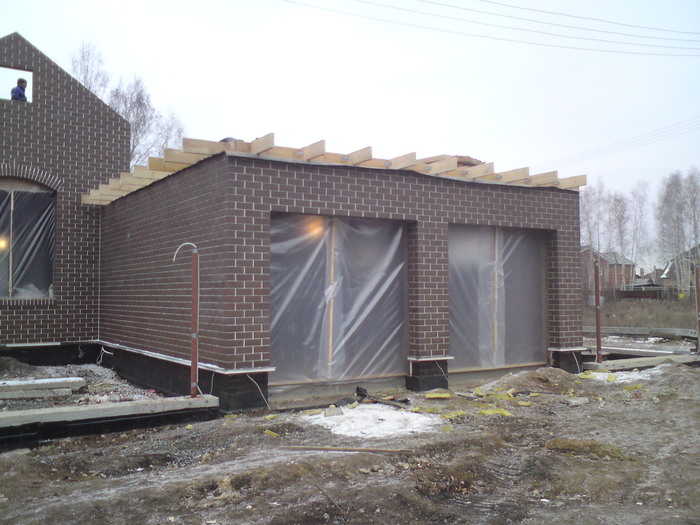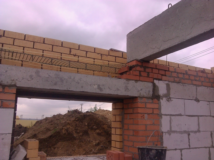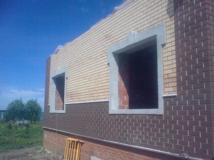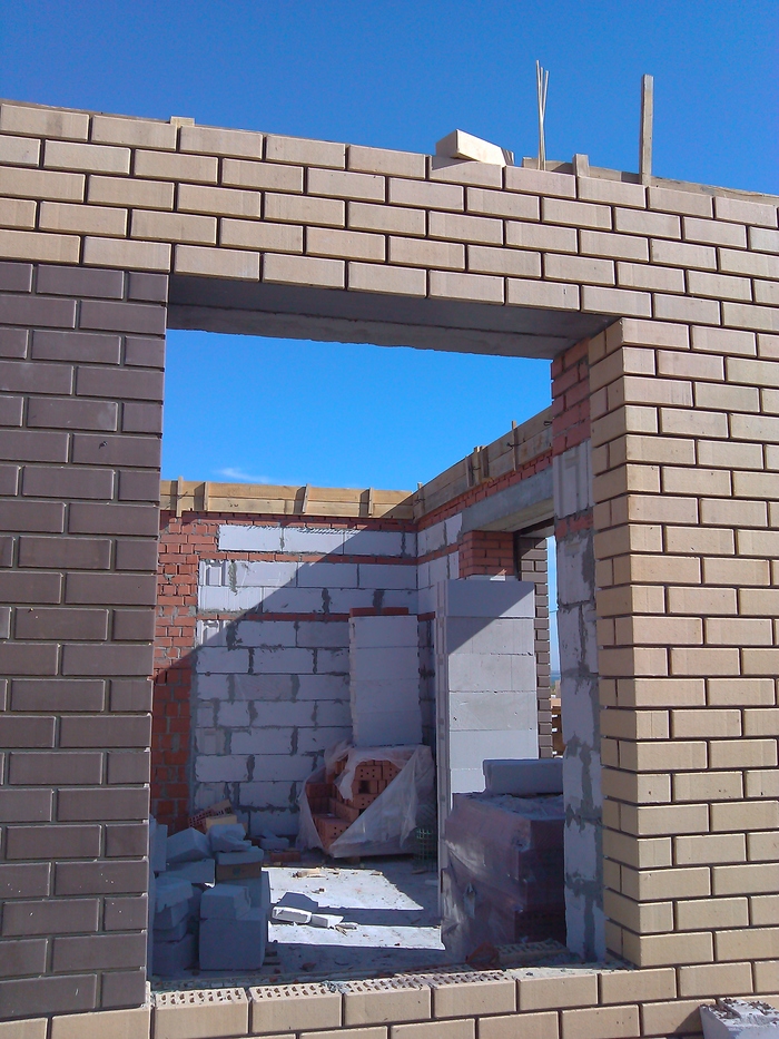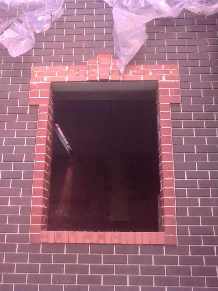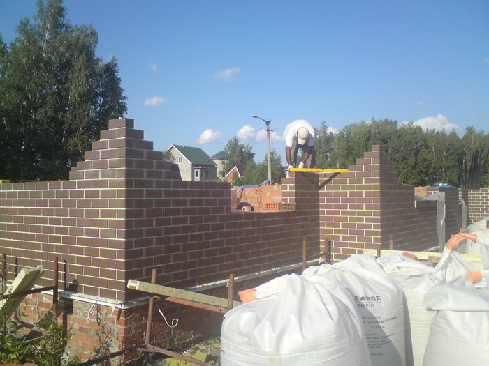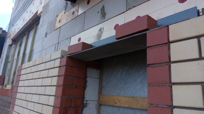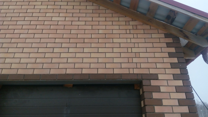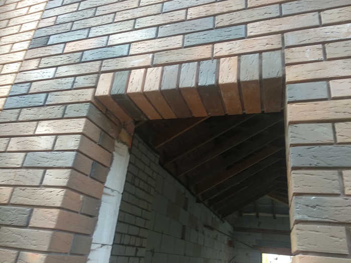 Ещё немного. Это Вы уже видели. Силикатный кирпич будет локальную нагрузку от арки и ендовы гаражной кровли держать, Облицовку подогнали под кратность кирпича. Кстати облицовочный кирпич стоил 9,5 рублей всего. Но кривой был как мусульманская сабля. Мы его правда выпрямили как могли искусной кладкой.