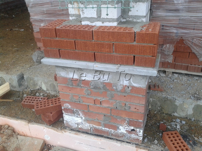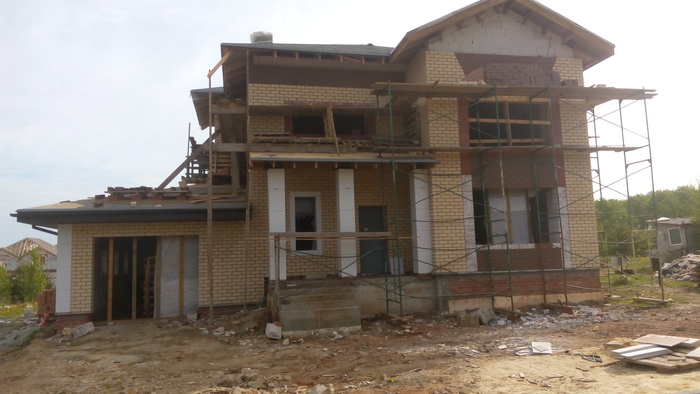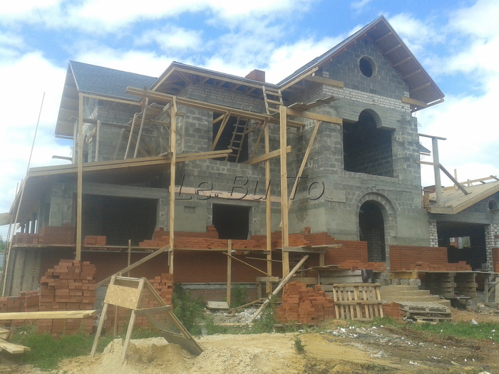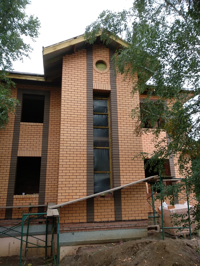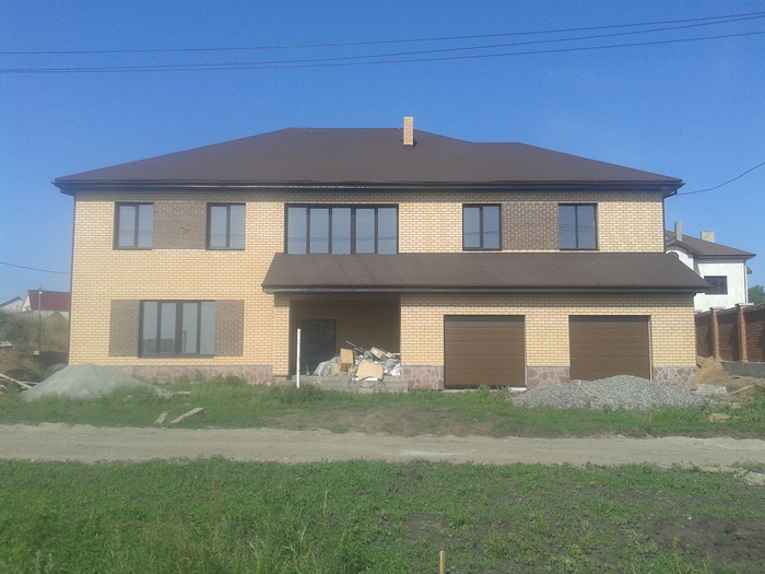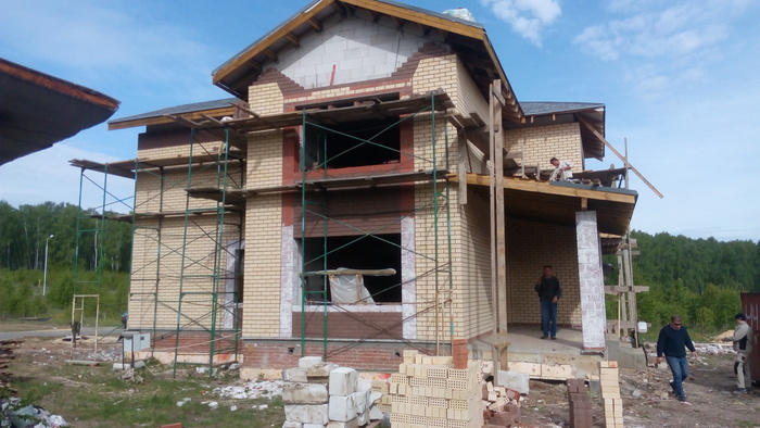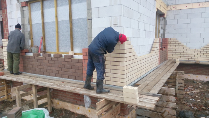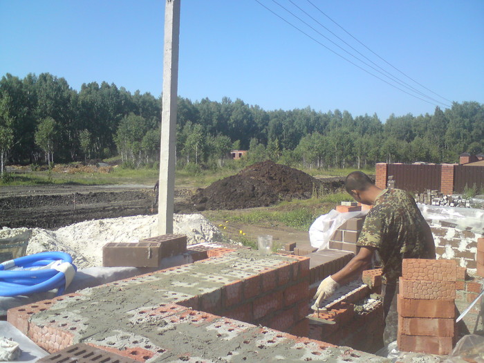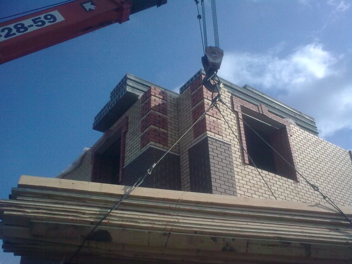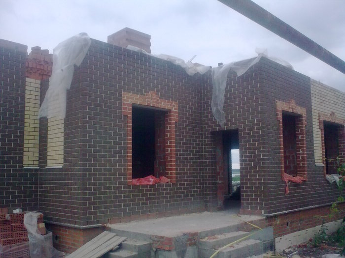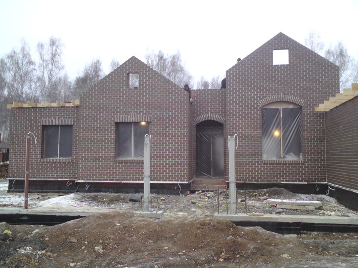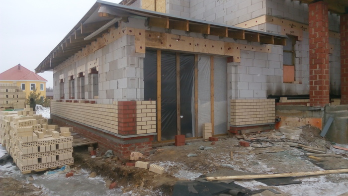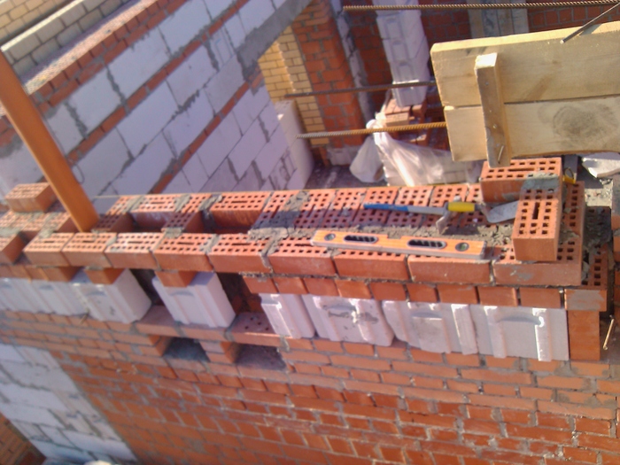 Ещё немного. Это Вы уже видели. Силикатный кирпич будет локальную нагрузку от арки и ендовы гаражной кровли держать, Облицовку подогнали под кратность кирпича. Кстати облицовочный кирпич стоил 9,5 рублей всего. Но кривой был как мусульманская сабля. Мы его правда выпрямили как могли искусной кладкой.