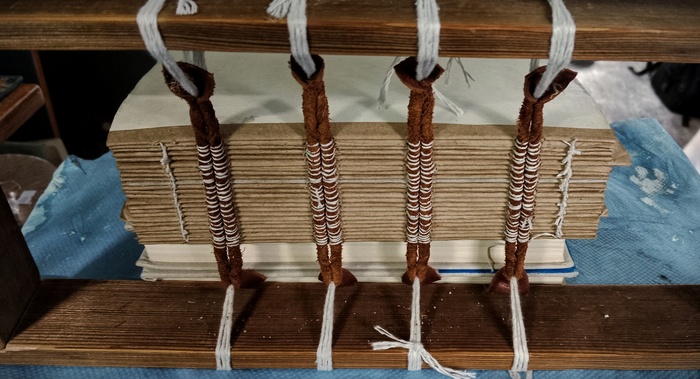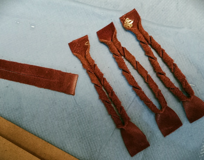 Из кусков кожи нарезаю такие вот фиговины макаронного вида. Это главная несущая конструкция во всей этой истории. К ним пришиваются тетрадки, крепится обложка. А ещё они дают +9 к крутости книжке.