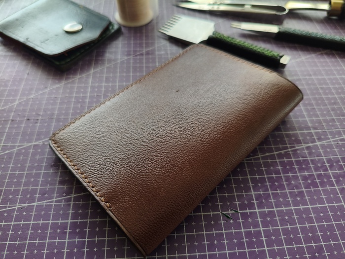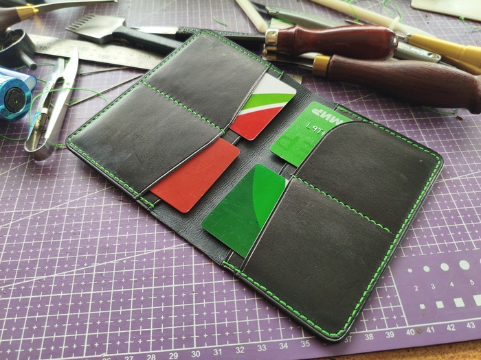 И черная обложка-портсоне из итальянской кожи Nero, с зелёной строчкой