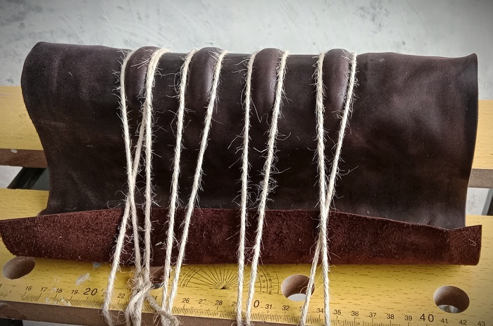 Дальше заправляю кожаные макаронины в раму, которую сам смастерил, и пришиваю вощёной нитью..