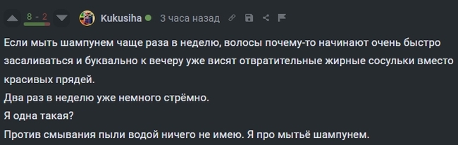 Сухая кожа головы: Если у вас сухая кожа головы, частое мытье может усугубить ситуацию, вызывая еще большее пересушивание и шелушение. В этом случае реже мытье головы может быть лучше.