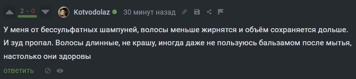 @Kotvodolaz, Подберите с такой же кислотностью шампунь но с сульфатами и эффект будет скорее всего тот же, SLS никак не влияет на жирность или объем, не вызывает зуда. Это все маркетинговые уловки. Возможно вы подобрали хороший шампунь, который вам подходит. Если волосы длинные, не стоит пренебрегать бальзамом, с ним всегда лучше, даже если кажется, что и так все чудесно :)