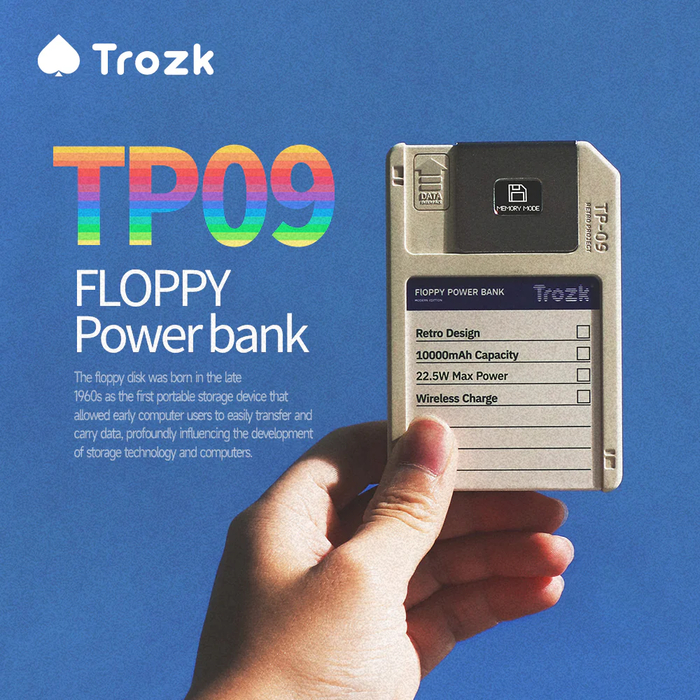 Внешний аккумулятор, дизайн которого вдохновлен дискетами 3.5 дюйма, но с современной начинкой. Емкость 10 000 мАч упакована в корпус толщиной всего 2 см. На лицевой панели расположен информативный дисплей, стилизованный под окошко дискеты, показывающий процент заряда и активный режим работы. Устройство поддерживает протоколы быстрой зарядки PD 3.0 и QC 3.0, выдавая до 22.5 Вт мощности.