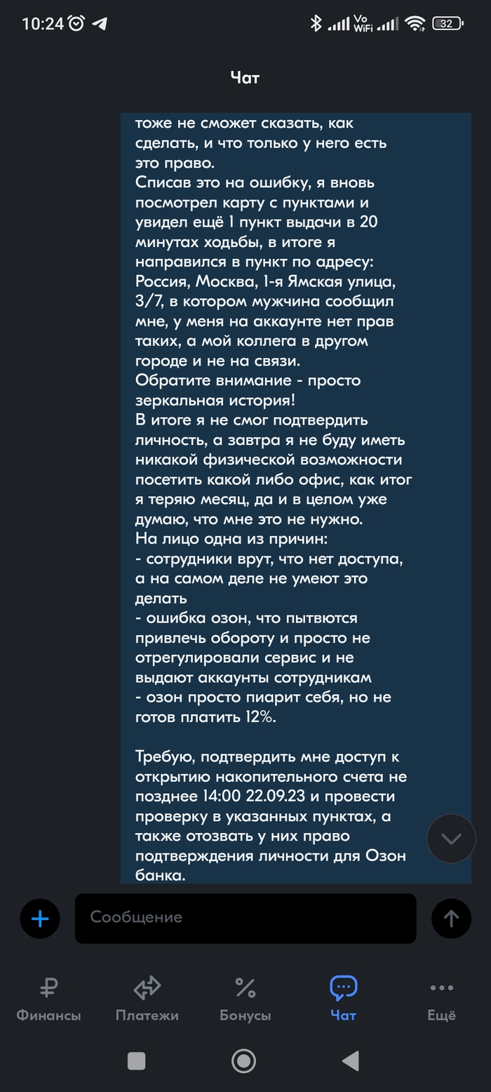 Часть первая: "Предистория" Важно для последующего рассказа отметить: - рассчетный период у меня начинается с 23 числа ежемесячно; - для открытия накопительного счета в OZON банке необходимо пройти верификацию личности в пункте выдачи. Ранее банковскую карту Мир я получал в первых рядах и при ее выдаче в пункте выдачи заказов я уже показывал паспорт для подтверждения личности, но этого OZON банку недостаточно - необходимо еще раз повторно проходить верификацию. В приложении ознакомился (21.09.23) с перечнем пунктов выдачи, которых в разы меньше от общего количества.
