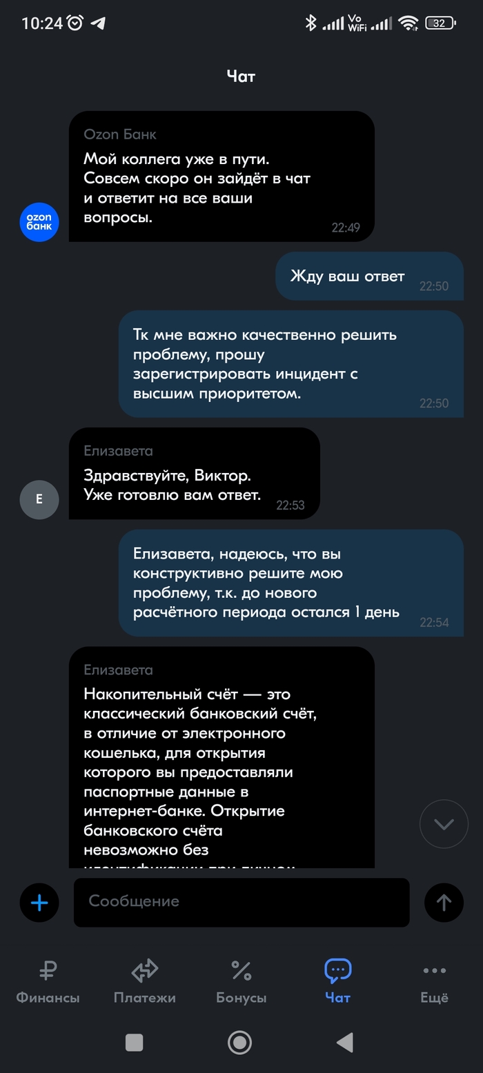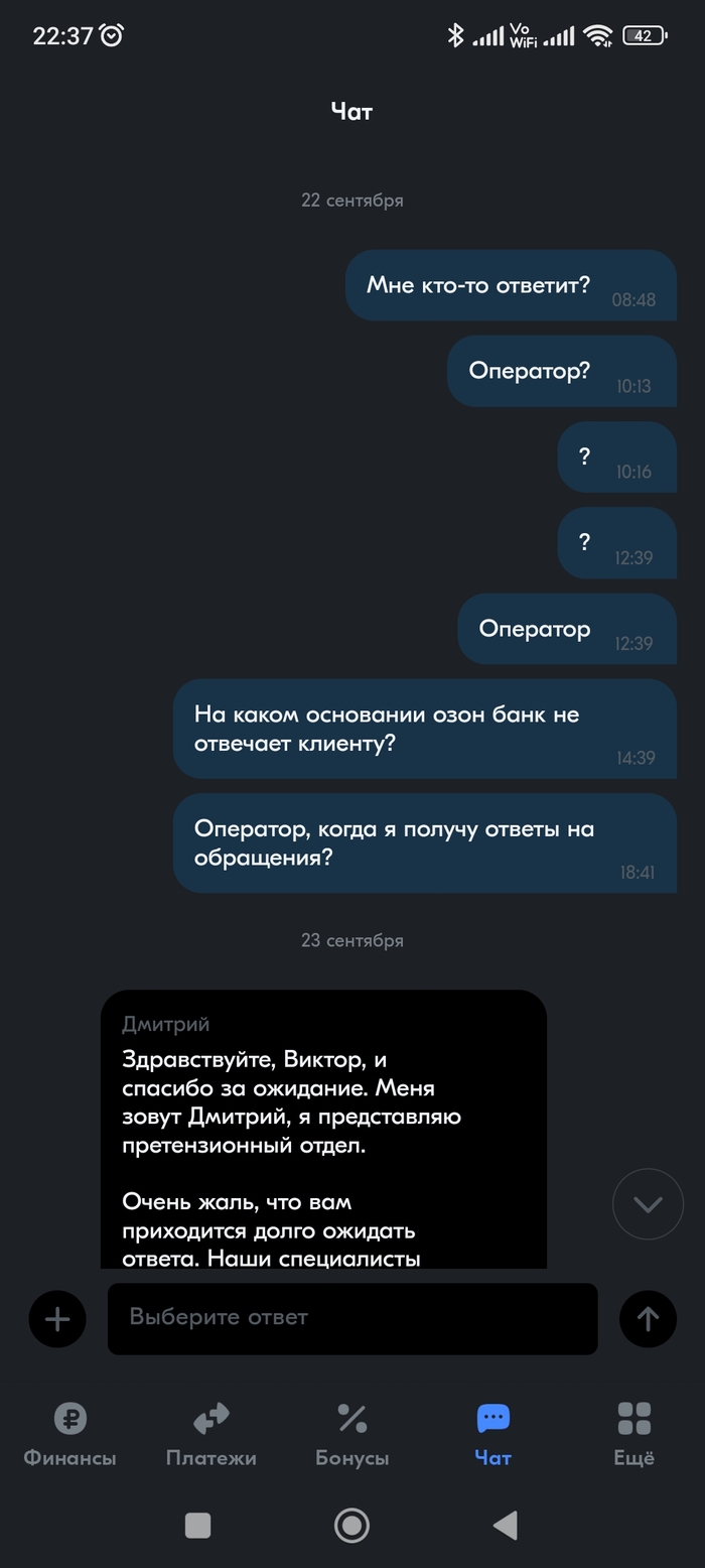 Я еще раз акцентирую оператору внимание, что это Ozon банк не выполняет условия обслуживания.