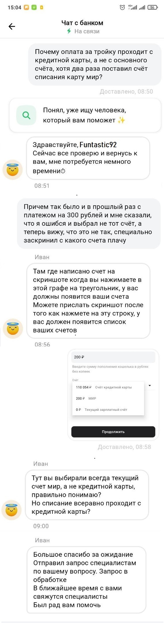Сегодня второй раз делал аналогичную операцию, уже четко обратив внимание, с какого счета я плачу, заскринил в качестве доказательств для общения с чатом. А списание, сука, опять с кредитки прошло.