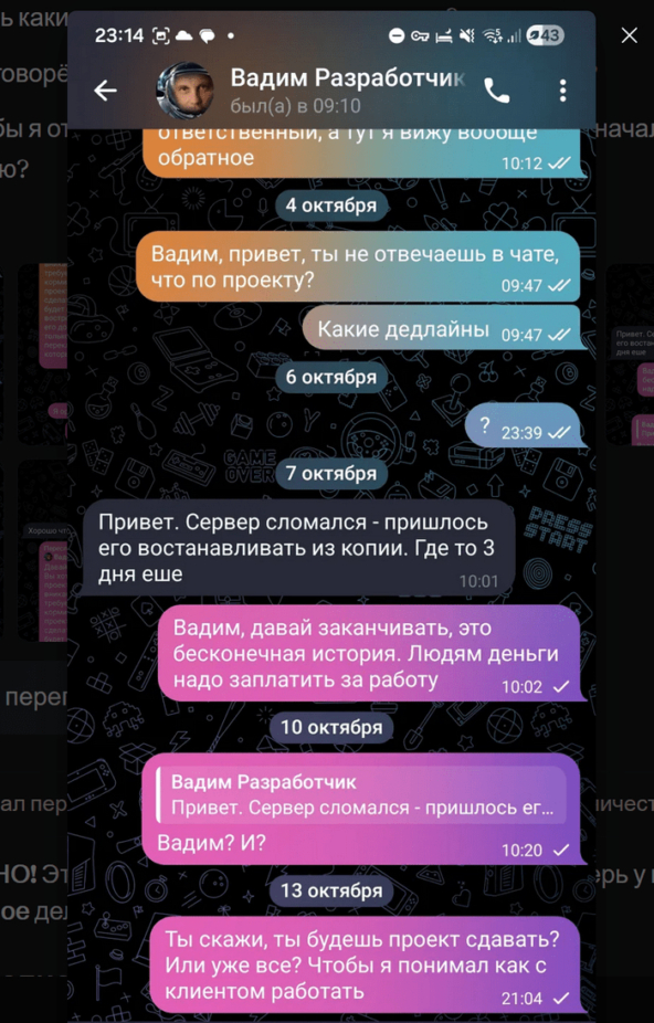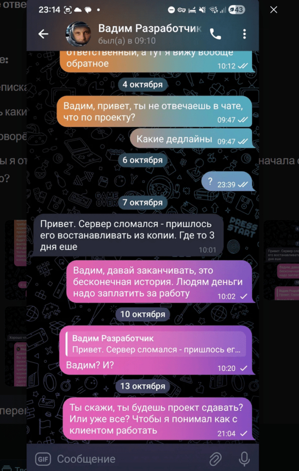 А на свой день рождения пишу последний пост и Вадим испаряется, а его жена начинает тереть сообщения. Так обычно поступают недобросовестные исполнители, которые не планируют выполнять обязательства.