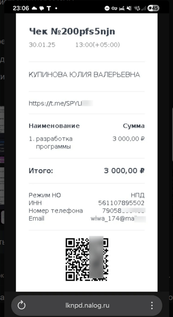 Чек НПД: №200pfs5njn от Купиновой Юлии ВалерьевныНазначение: "Разработка программы"