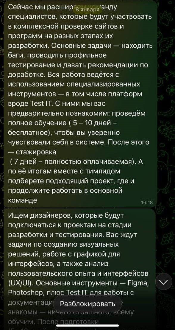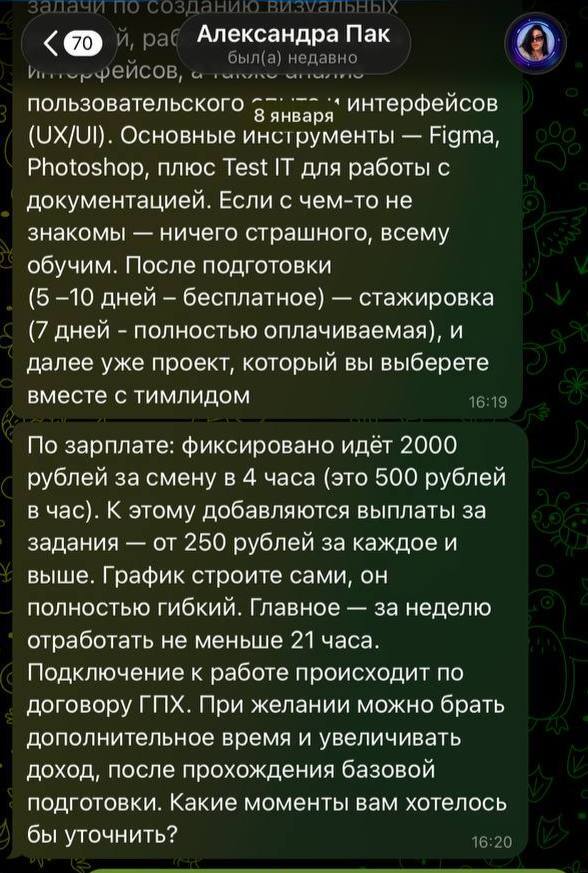 В этом письме был ник в тг, к кому мне нужно было обратиться. Захожу в телеграм, вписываю этот ник, и мне высвечивается дамочка (дамочка ли по ту сторону) с именем Александра Пак. Я написала "Здравствуйте. Я получила письмо на собеседование". У нас с ней завязалась беседа (подробно это расписывать не буду, там было чисто знакомство и т.д.). И говорит, что на данный момент свободны только две позиции: дизайнер сайта и тестировщик. Выбирайте, что вам по душе. И также она присылает, что всему обучим, не волнуйтесь.