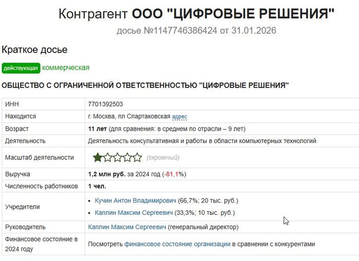 Скидывают мне ссылку на их сайт, где я должна была пройти обучение. Но! Естественно, перед тем, как вообще начать всю эту движуху, нужно же ознакомиться с данной компанией. И вот тут самое интересное. Во-первых, в этой ссылке был уже контракт, с которым мне дали ознакомиться. И там было ИП, имя руководства и т.д. Начинаем гуглить и нагуглили мы то, что такая компания существует, владелец тот, который был написан в контракте. Более того, компания была зарегистрирована аж в 2014 году, и начальный капитал у них составлял 30к. В их компании числится 1 сотрудник... Ладно, допустим. Но данная компания за 2024 заработала ЗА ВЕСЬ ГОД - 1,2 миллион. Смешно. Это же какая заработная плата была у сотрудника (а их там явно не один)? У моих знакомых за год зарплата составляет 800к (на одного сотрудника).