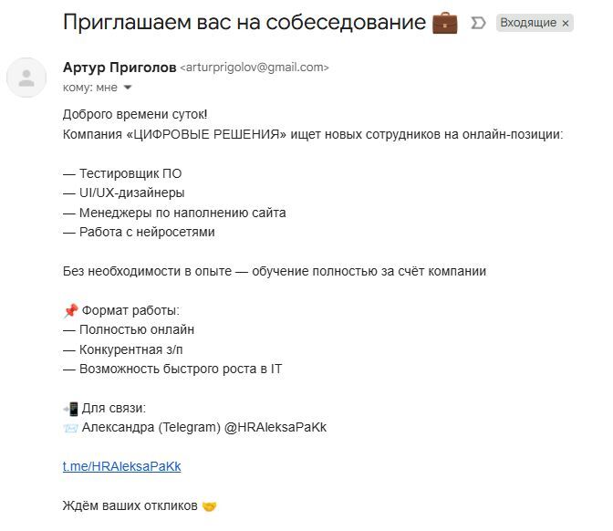 Всё началось с того, что я получила письмо на почту с приглашением на собеседование. Я в поиске работы и оставляла своё резюме на hh.ru. Сперва мне пришла мысль, что, наверное, мне ответили те, на кого я откликалась (откликов было много, не помнишь уже на кого обращала внимание).