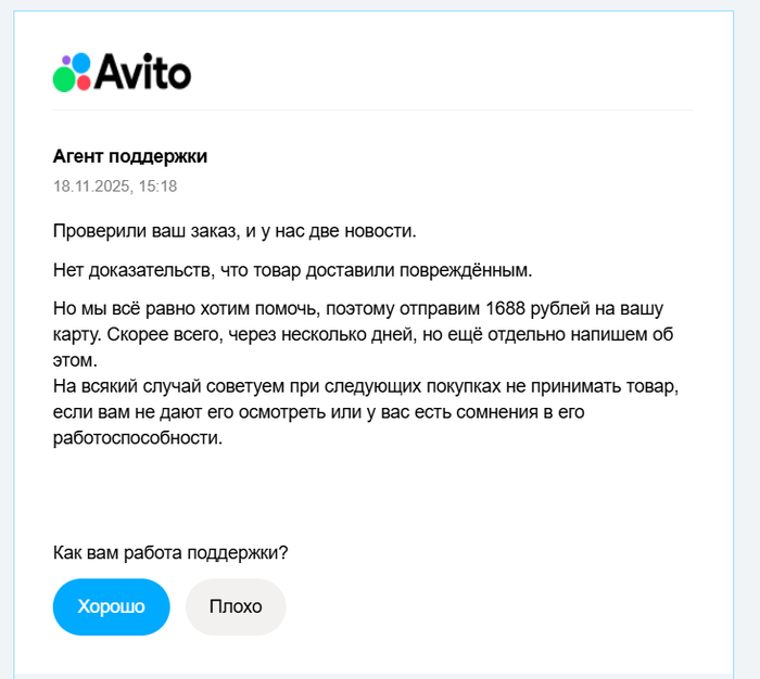 А вот начинаются чудеса, которые заставляют задуматься, а не попал ли я в другую вселенную. Поддержка авито, проверив моё обращение ВЕРНУЛА деньги. Чудо Господне, не иначе.