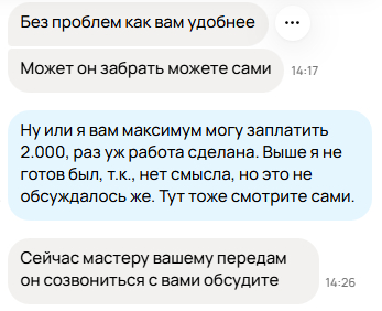 Моя бывшая девушка решила поиграть в самостоятельность, я тогда работал в графике 5/2 по 14 часов, машинка перестала сливать воду в первую мою рабочую смену. Я ей сказал, что на выходном разберусь с машинкой, так как после быстрого осмотра понял, что нужно менять насос на слив. Погуглил какие они бывают, на работе, нашёл подходящий, ну и думал в выходной куплю да поменяю. Но она решила не ждать, нагуглила сайт, вызвала мастера, ей за 1000 обещали поменять. Приехали два пацана лет по 19, разобрали машинку, покачали головами и сказали что насос ремонту не подлежит, машинка древняя(там была Занусси 199х года), насос косаря в три обойдётся, ну и за работу ещё 5000. Слава богу у неё денег не оказалось таких, она отдала 1500 из всех что были у неё, они забрали насос и ретировались, попросив подготовить 6500 к их приходу на этой неделе. Вернувшись со смены, обнаруживаю посреди кухни стиралку разобранную частично, она старая тяжеленная, спрашиваю у своей, что произошло, и охуеваю. Позвонил на сайт, узнал у оператора что ребята приняли заказ, узнали адрес и телефон, и тут же от заказа отказались типа далековато.(Может там сайт разводил конечно был, но я не вникал). Ну ещё они телефон свой отключили, с которого звонили. Решил действовать по ситуации. На момент начала 2021 года 8 тысяч рублей это слишком много за замену насоса как мне кажется, ну и изменение стоимости услуги на лету очень мерзкая тема. Но 1500 не такие уж большие деньги за жизненный урок для девушки подумал я, решил что если они до выходных не объявятся, всё сам починю и забуду о ситуации. Но ребята оказались более жадными и решили всё-таки добрать оставшиеся 6500. В назначенный день объяснил ситуацию начальнику на работе, отправил девушку в ТЦ погулять и сел дома ждать ребят. С первой секунды как они меня увидели, в их взгляде читалось что все их планы порушились, но они не отпускали надежды. Вытащили снова машинку, показали мне китайский насос за 500 рублей, который в принципе я и собирался ставить, сообщили что это оригинальный финский насос за 3000 рублёв. Я со всем соглашался, стараясь быть максимально простодушным и с интересом наблюдал за их работой пытаясь изобразить полное восхищение их работой. После того как машинка была проверена, последний болтик закручен отблагодарил их, сообщил что 8000 нет, так как мы рассчитывали на 1000, и оставшиеся 6500 я с ближайшей зп им переведу и закрыл перед их носом дверь. Не могу быть уверен что их работа не стоила 8к, но вот тот факт, что они увидев в заказчиках скромненькую простодушную девушку решили собрать с неё вместо обещанных 1000 целых 8000 меня дико возмутил, я ещё неделю крутил бумажку с их номером карты в руках, ощущая себя подлецом, но потом успешно смог прогнать эти мысли. Но уверенности что я поступил правильно до сих пор нет.