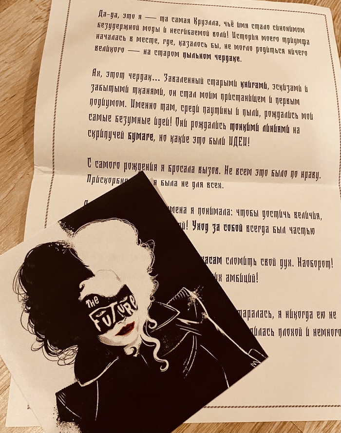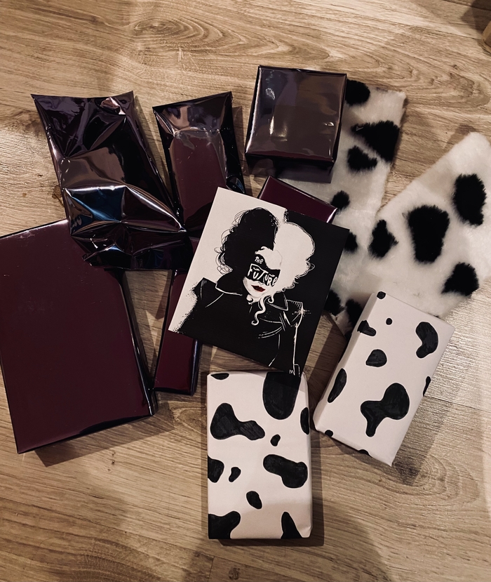 Открываю коробку, а там не просто упаковка — это целый перформанс в стиле Круэллы: черное золото, «шкурки» далматинцев письмо пояснение и даже открытка с Круэллой — вжух, и настроение с нуля до глупой улыбки не сходящей с лица