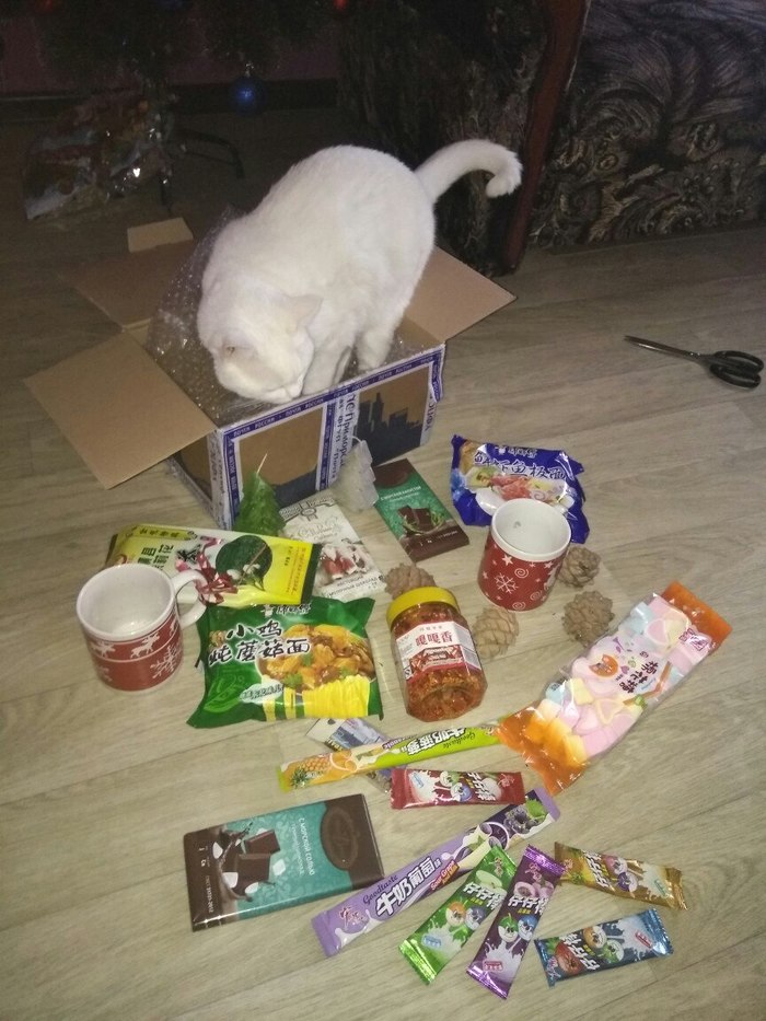 И вот сидим мы во всём этом многообразии подарков с кошкой, улыбаемся и чувствуем появление новогоднего настроения. Спасибо Маше)